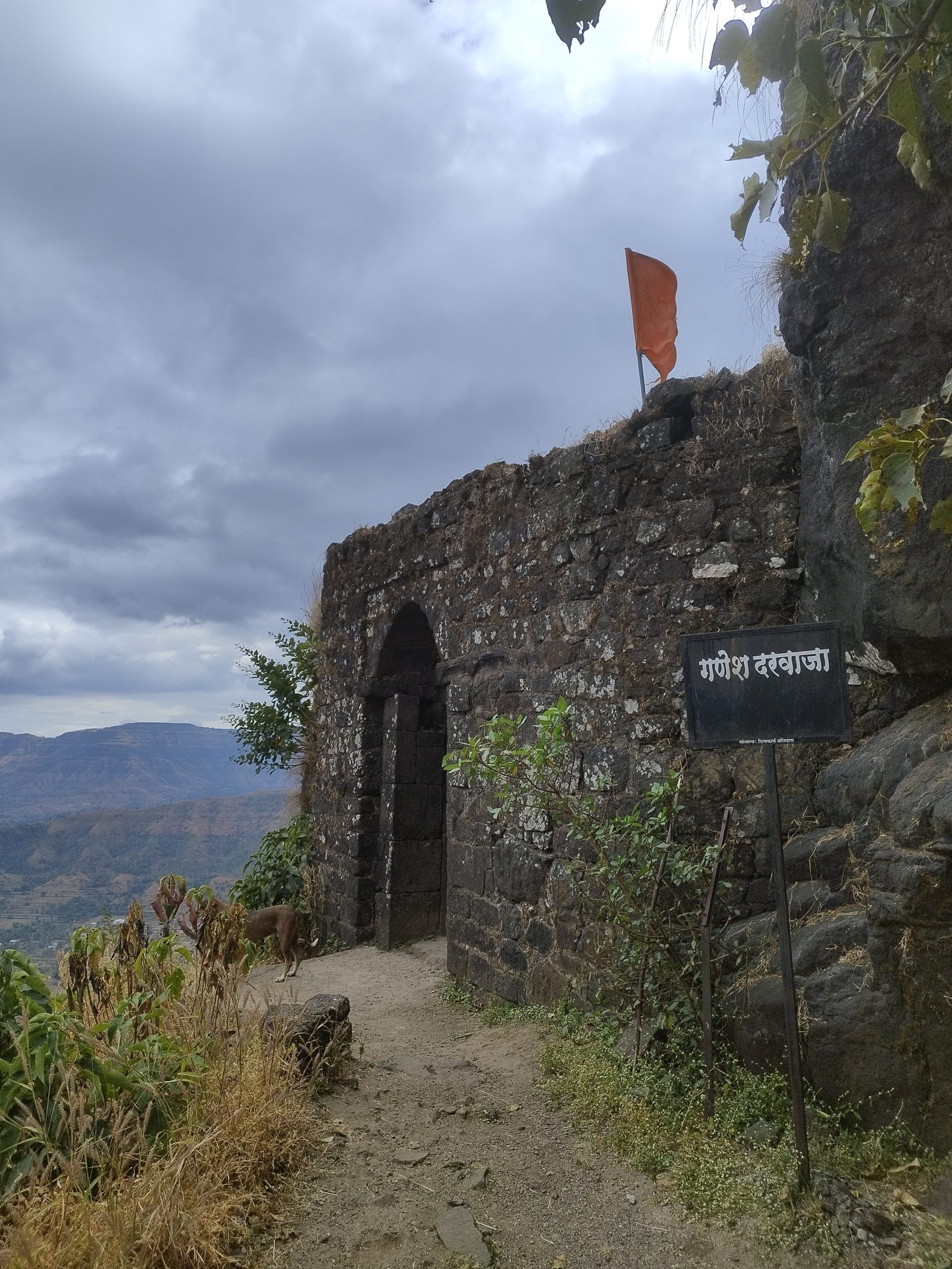 गडाचा पहिला दरवाजा म्हणजे गणेश दरवाजा, दरवाज्याच्या चौकटीवर गणेशपट्टी आणि वर मेहरब कोरलेले आहे.